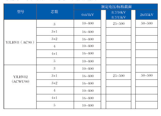 緊壓絞合鋁合金導(dǎo)體、阻燃交聯(lián)聚乙烯絕緣、軋紋聚酯帶繞包、鋁合金帶連鎖鎧裝護(hù)套、5000V及以上采用內(nèi)、外屏蔽層。