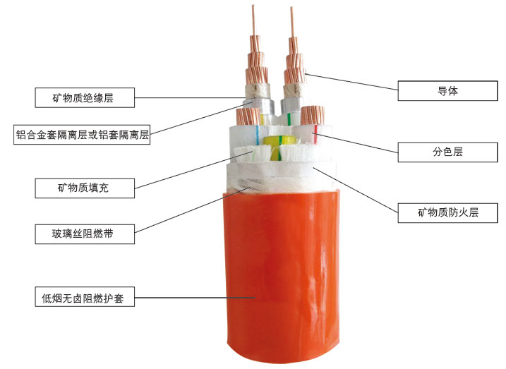 ①銅導(dǎo)體②金云母帶絕緣③鋁合金金屬套④交聯(lián)隔離套⑤Mg(OH)或Al(OH)耐火層⑥無鹵低煙聚烯烴外護(hù)套